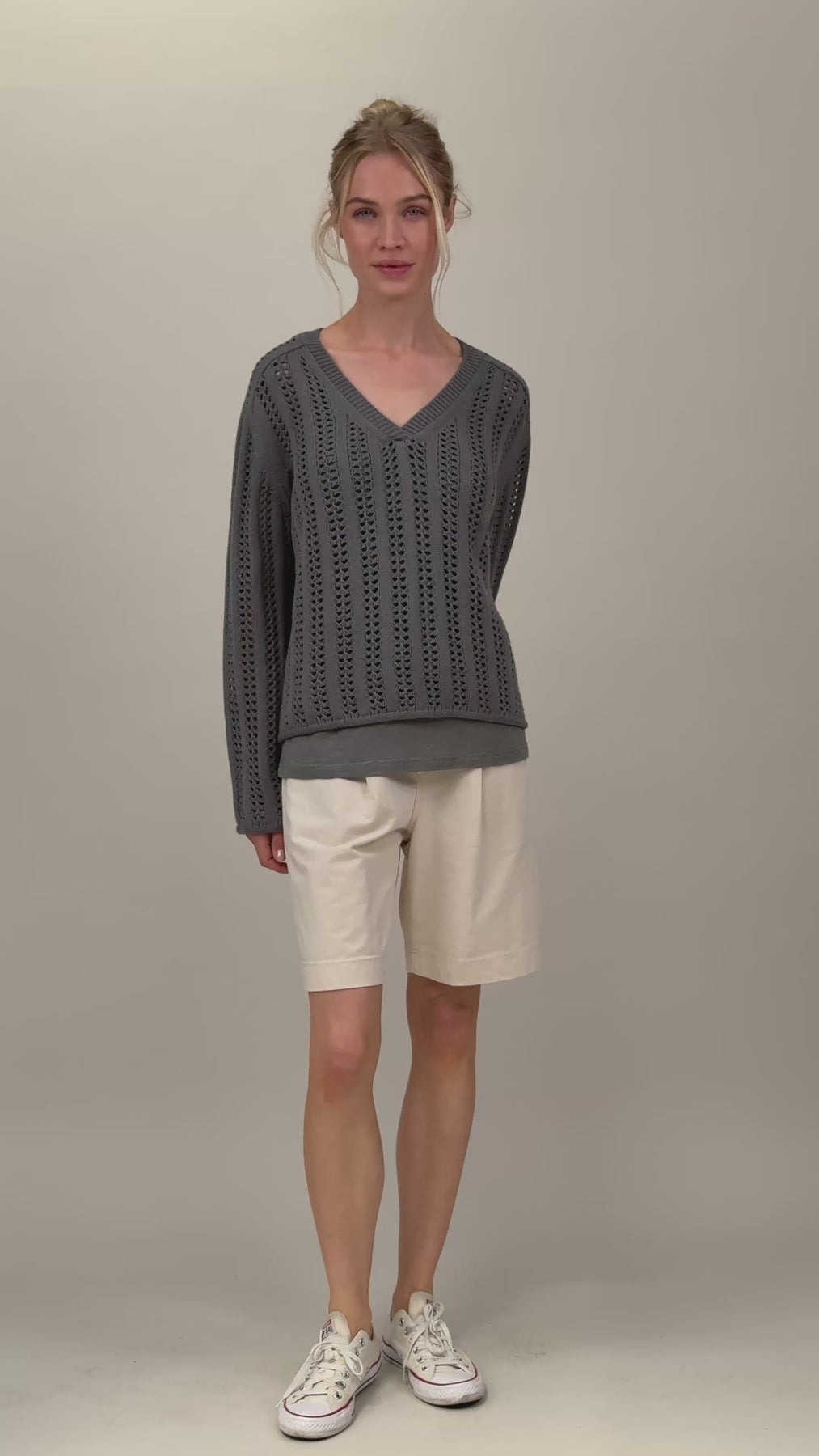 An open-knit sweater crafted in twisted cotton with a breathable structure and a soft washed feel. Designed in a loose fit with a straight silhouette and an airy knit pattern that adds lightness and texture.
