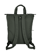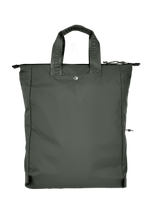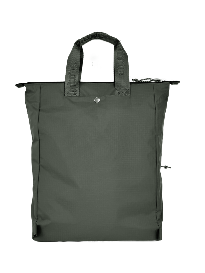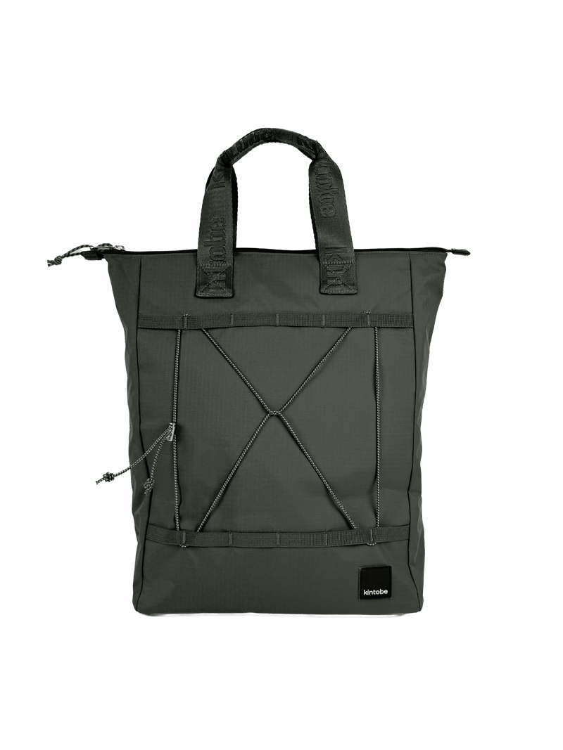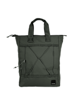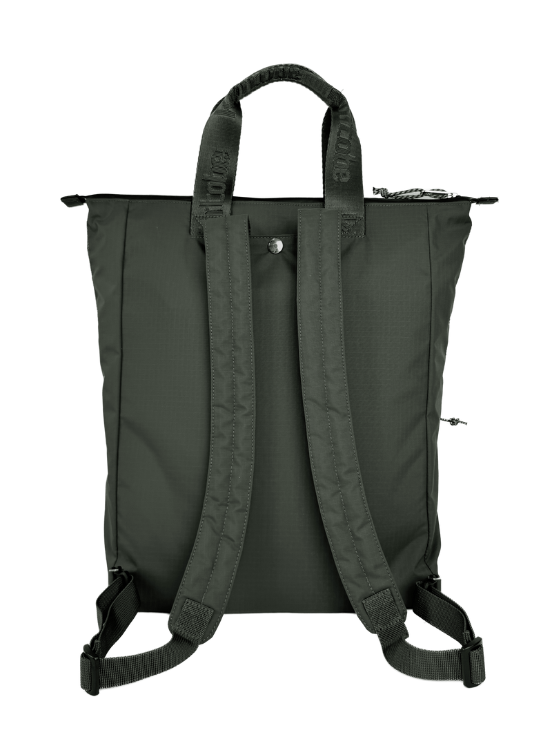 TATE is a streamlined, convertible bag that can be used both as a tote bag and as a backpack. It features removable shoulder straps that can be tucked away in the back slip pocket. It has a top zipper opening and carry handles on top. On the front, it includes webbing straps for enhanced functionality, as well as a reflective elastic bungee for extra storage on the outside and visibility in low light.