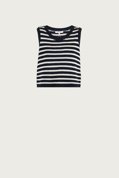 A sleeveless knit top crafted in an organic cotton and linen blend with a soft washed finish and a fine rib structure. Designed in a regular fit with a clean, close silhouette and a lightweight, breathable feel.